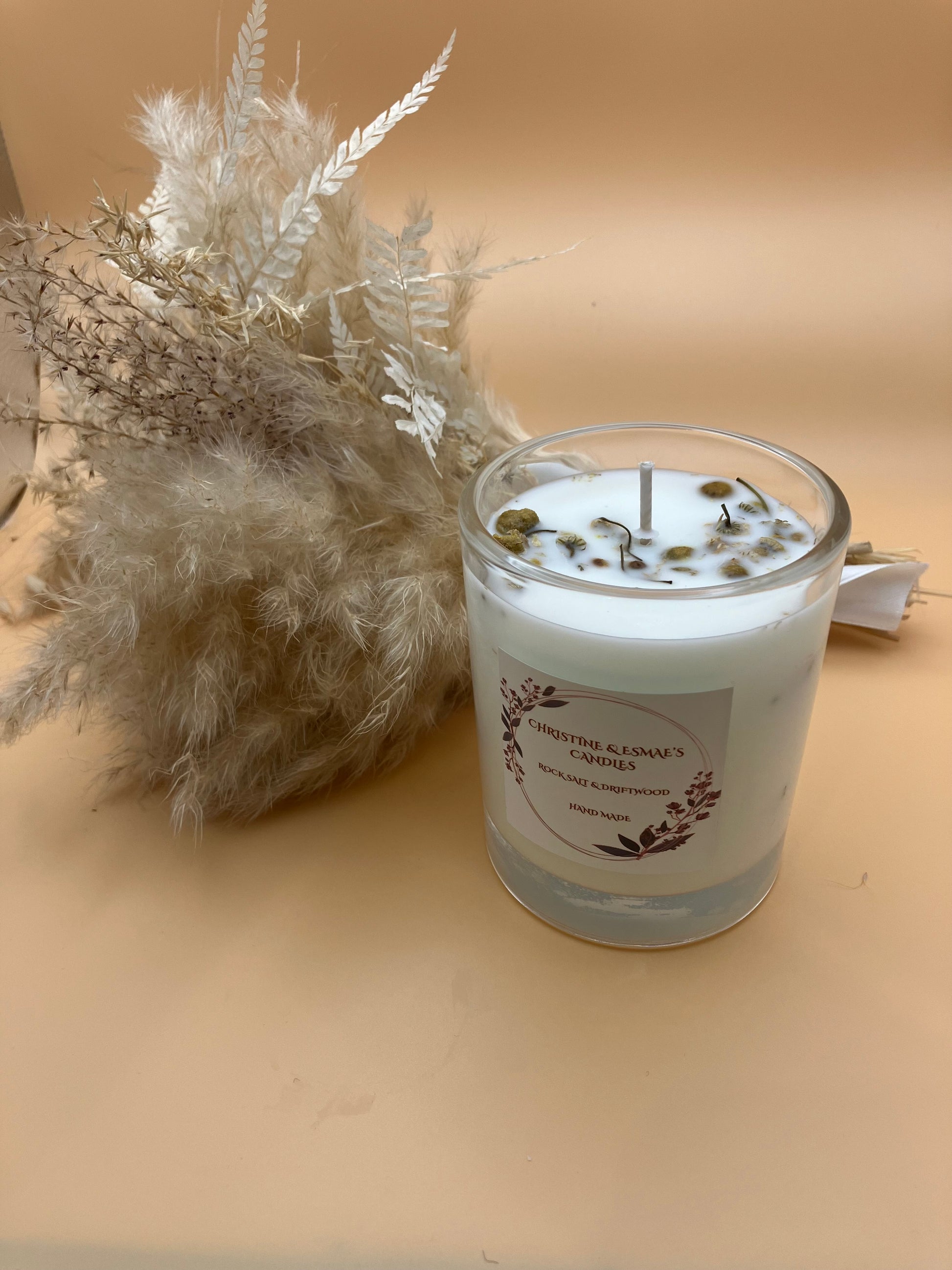 Serenity in a Jar: Rock Salt & Driftwood Fragrance Candle with Chamomile flowers in a 30 cl jar